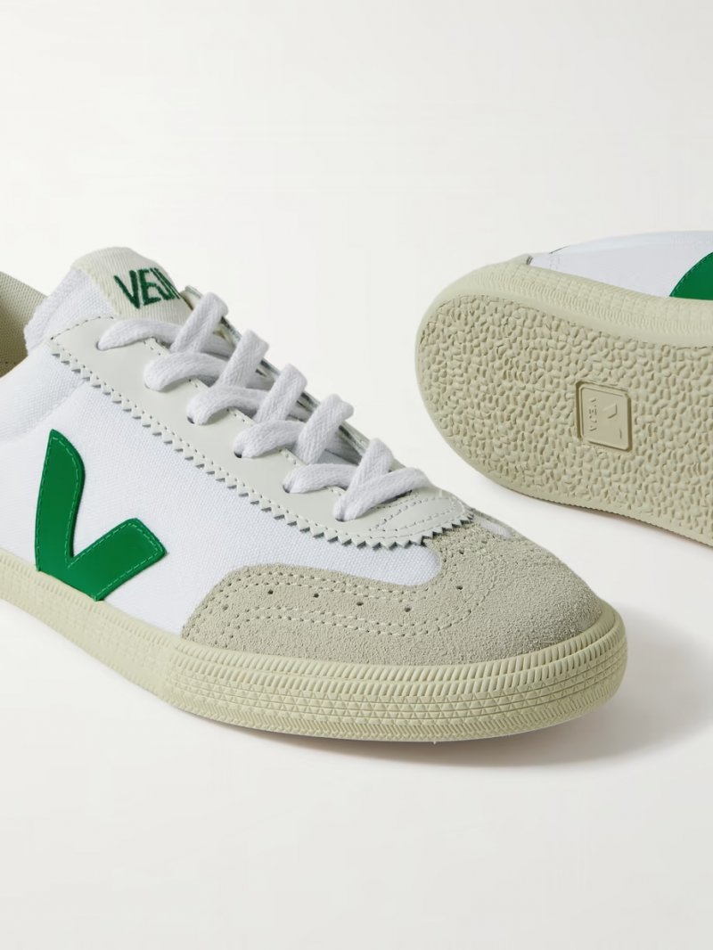 - White canvas, off-white suede, green leather