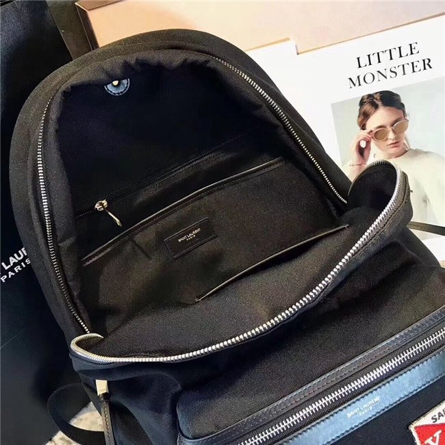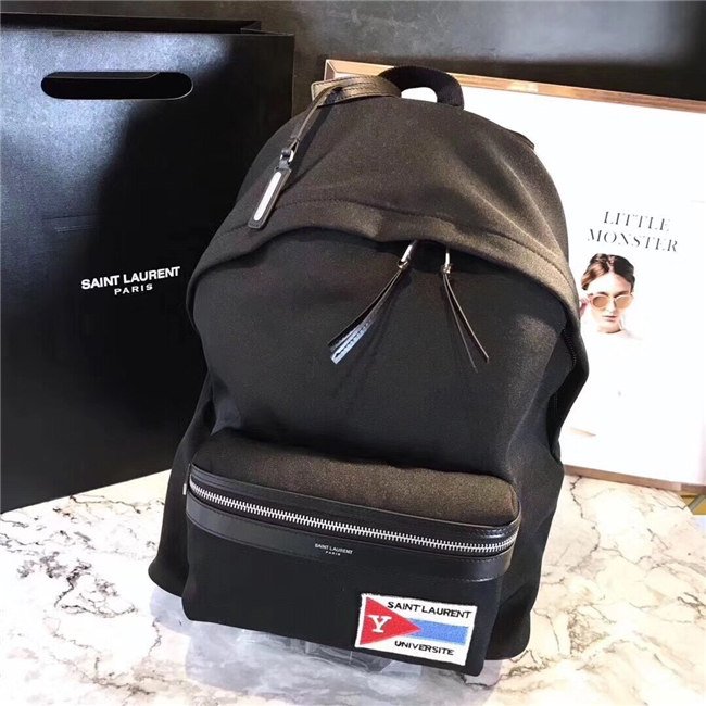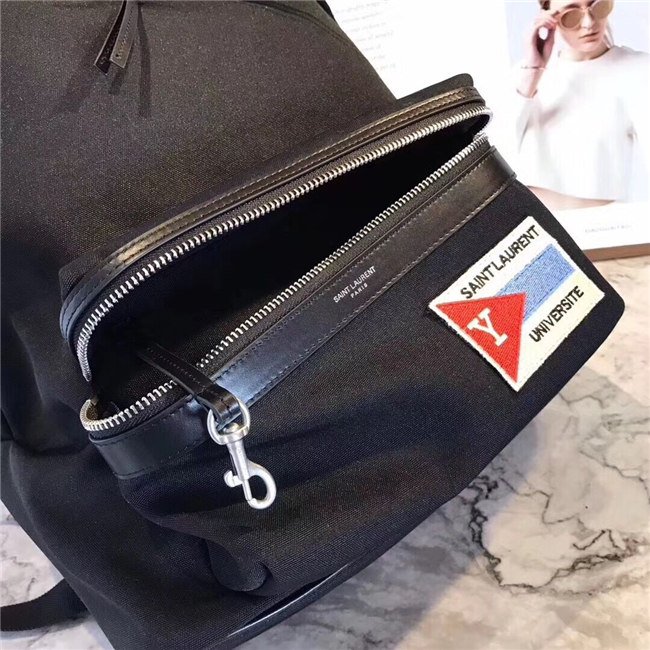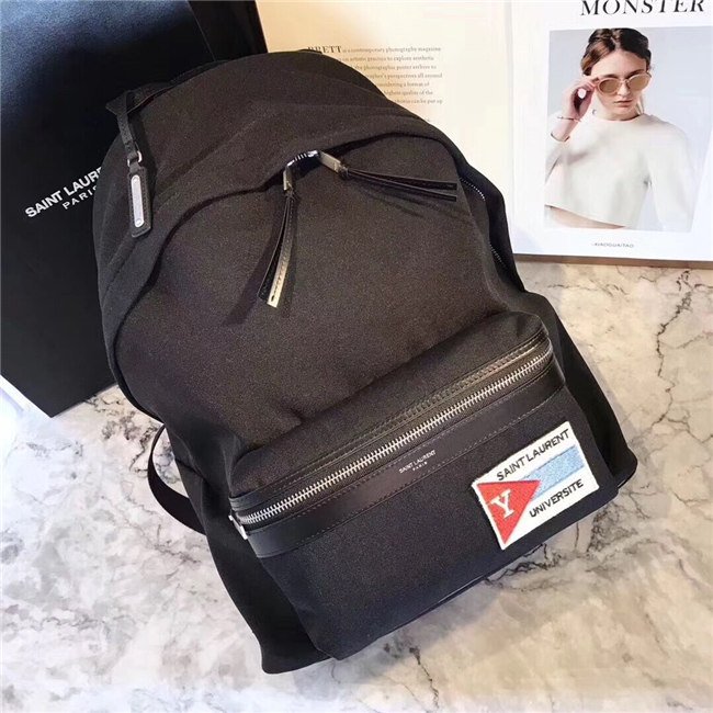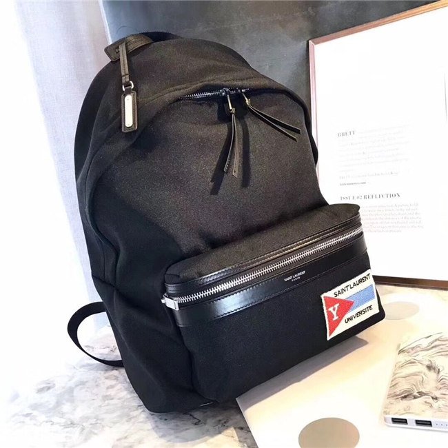 LEATHER TRIMMED BACKPACK WITH SAINT LAURENT UNIVERSITE PATCH ON POCKET, SAINT LAURENT SIGNATURE EMBOSSED EXTERIOR ZIP POCKET, CELL PHONE POCKET, ZIP COMPARTMENT AND PADDED SLOT POCKET.