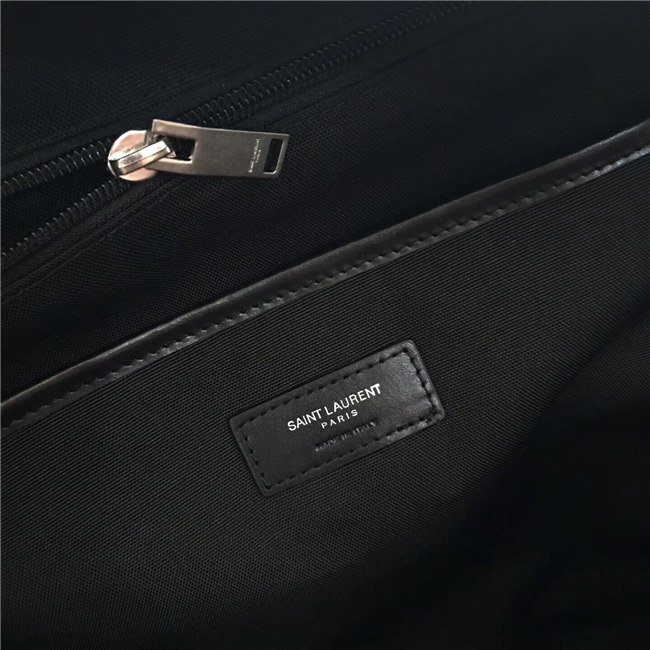 LEATHER TRIMMED BACKPACK WITH SAINT LAURENT UNIVERSITE PATCH ON POCKET, SAINT LAURENT SIGNATURE EMBOSSED EXTERIOR ZIP POCKET, CELL PHONE POCKET, ZIP COMPARTMENT AND PADDED SLOT POCKET.