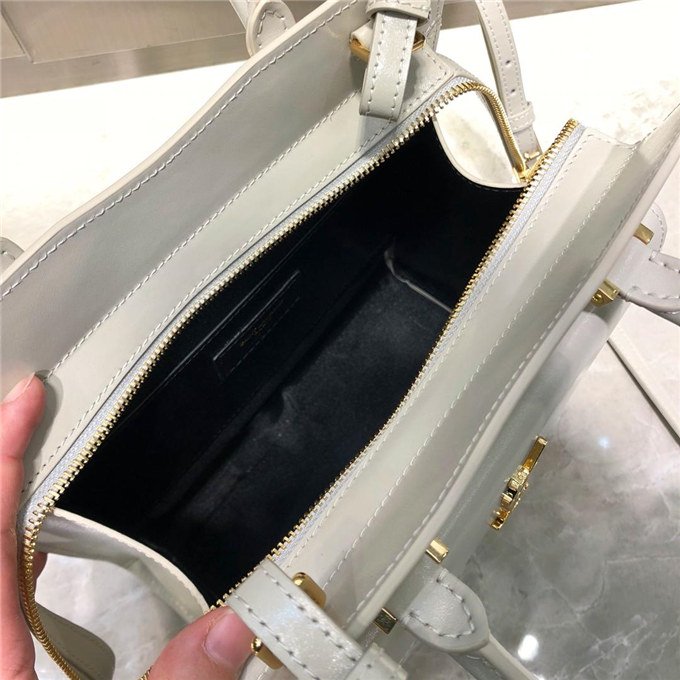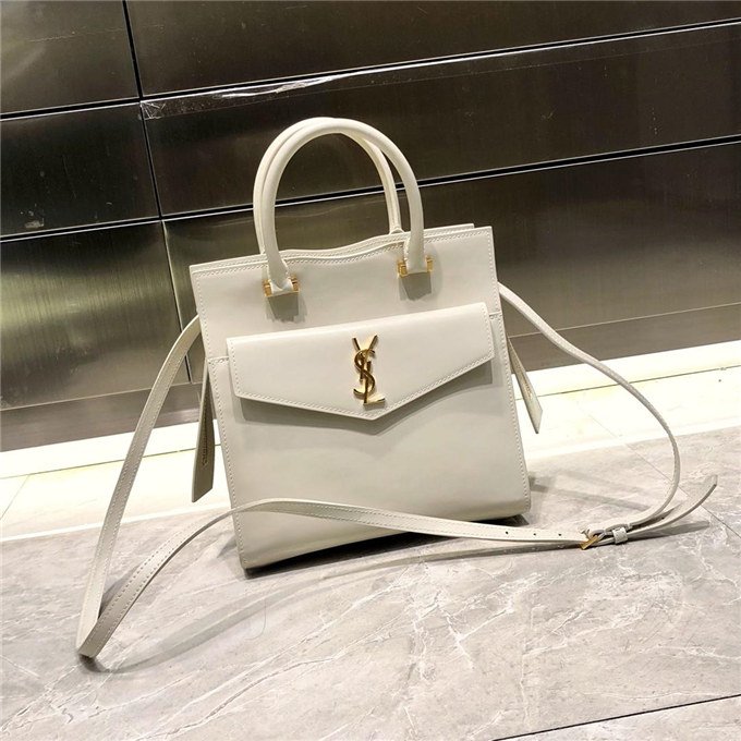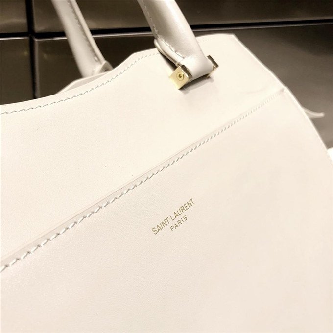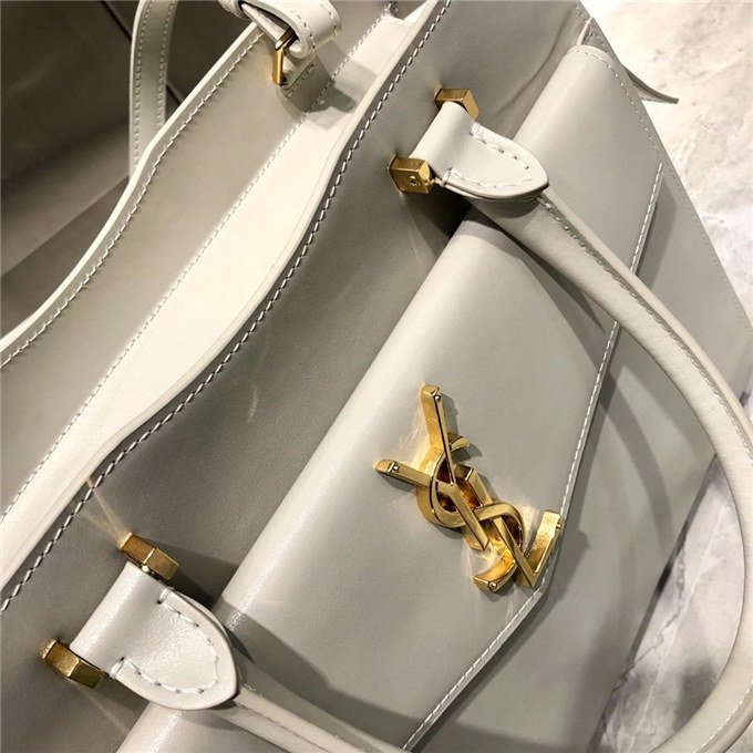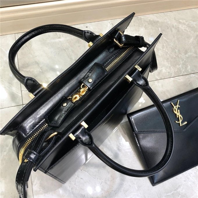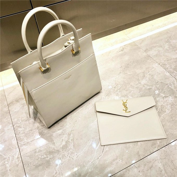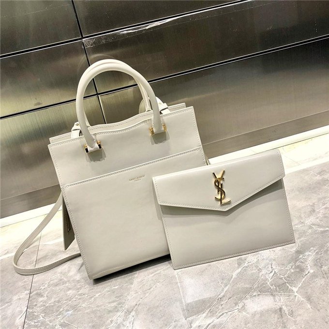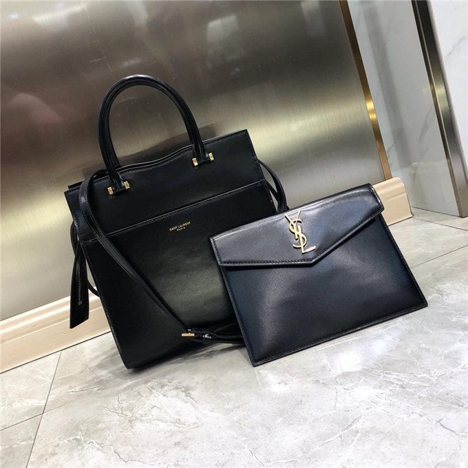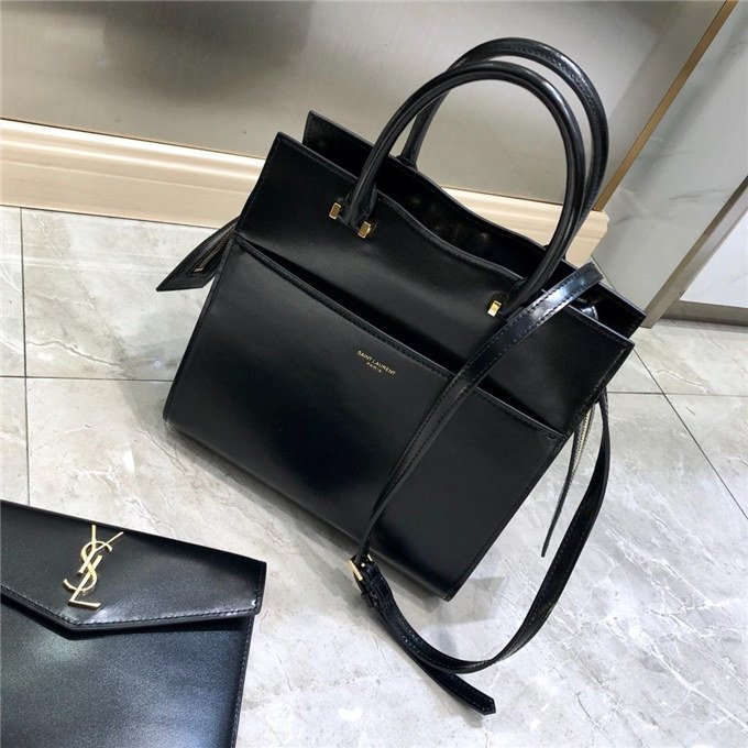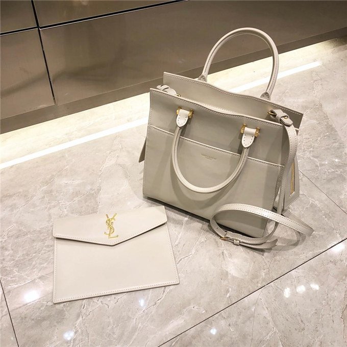 TOTE BAG WITH LEATHER HANDLES, A REMOVABLE SHOULDER STRAP AND A REMOVABLE ZIPPERED MAGNETIZED CLUTCH, DECORATED WITH METAL YSL INITIALS.